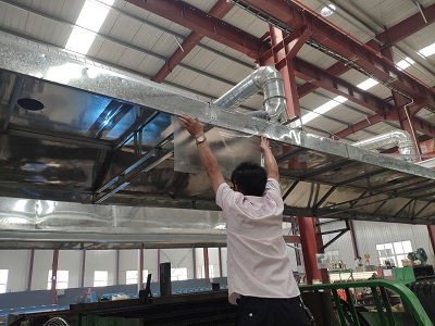 集氣罩→管道→ 濾筒式除塵器→ 活性(xìng)炭吸附箱→ 離(lí)心風機 (增(zēng)加變頻器)→ 排(pái)空管道